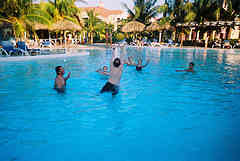 Well this game is called strip volleyball, it's better to play with at least 4-5 males and females; we played it California Los angels around the summer time at my house. This is an adult pool party game that we usually played at several of our friends pool parties. We didn't think it would be suitable for kids to do. It is basically strip volley ball.