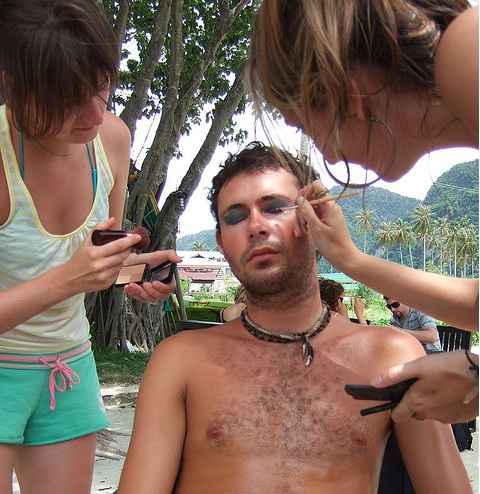 It wasn't a very formal party; people came and went throughout the night. The makeup artist went about her business during the night. The guys were mostly just having their eyes done at their girlfriends urging. They said it would look good on stage. A few did a bit reluctantly, but some passed. More than once I was asked if I was interested and I kept declining. Deep down I was interested, but
