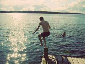 So I stripped down to nothing but my birthday suit and swam out to the dock. As I swam back I heard a lot of laughing coming from shore, but I really did not think too much of it. I finally reached shore and when I looked to grab my clothes they were nowhere to be found. After a few seconds, I looked up and saw one of the girls running back towards the house carrying all of my clothes in her arms.