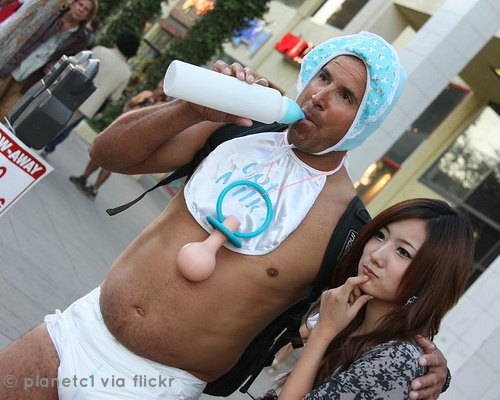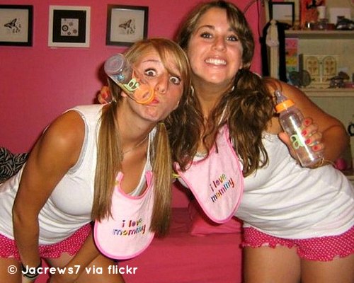 Dress up as a baby and get bottle-fed with milk. For Girls: If you want to make it sexy, you can also have a girl "breastfeed" some lucky dude! |